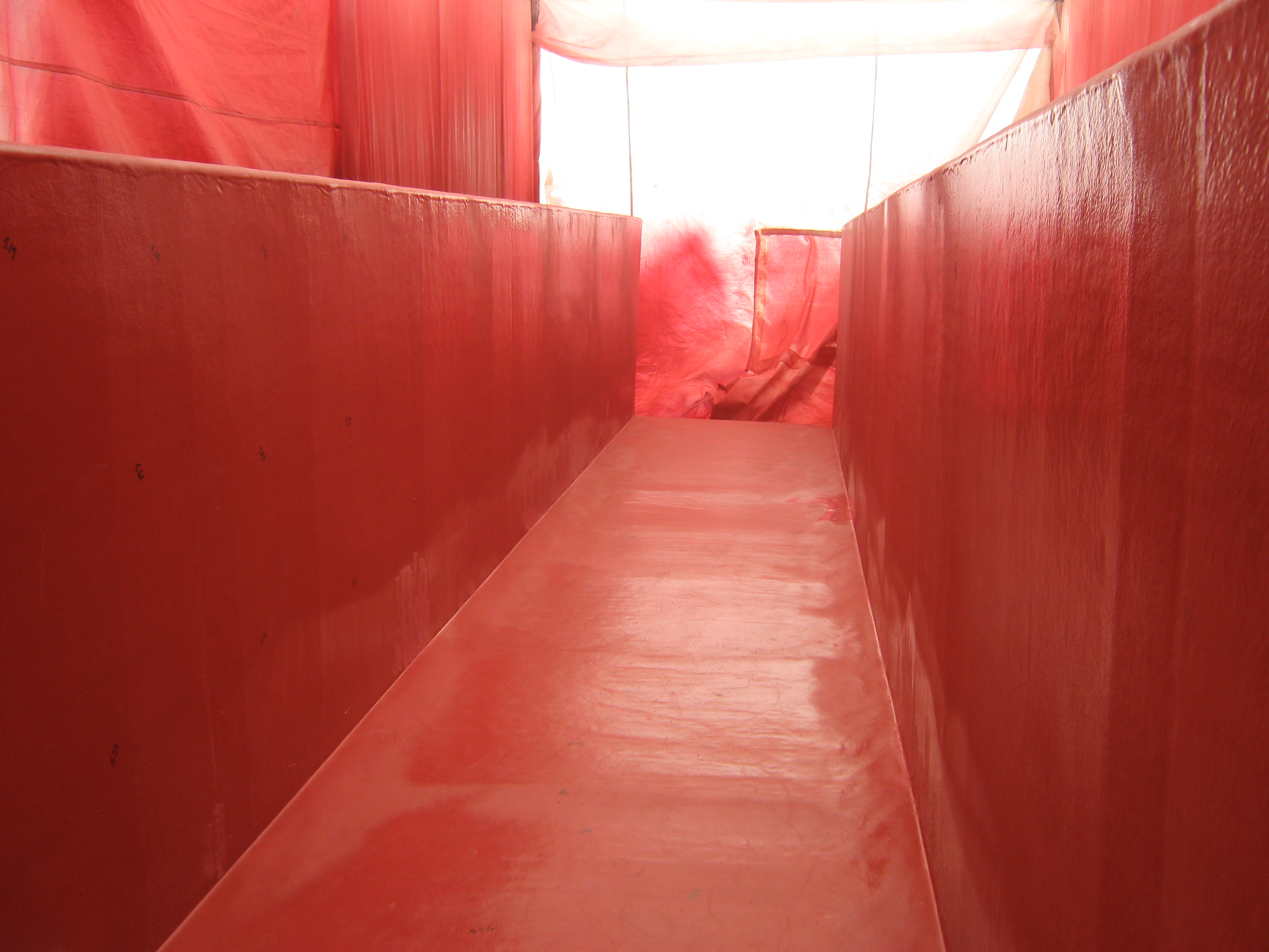 Inmediatamente después del granallado, y respetando los tiempos máximos de exposición al ambiente para evitar la reoxidación del acero, se aplicó la poliurea spray mediante equipos de proyección de alta presión y temperatura, que mezclan los dos componentes reactivos en la punta del pistón y proyectan el material sobre la superficie preparada. La poliurea cura en segundos, formando una membrana continua, sin juntas y de espesor uniforme controlado.
