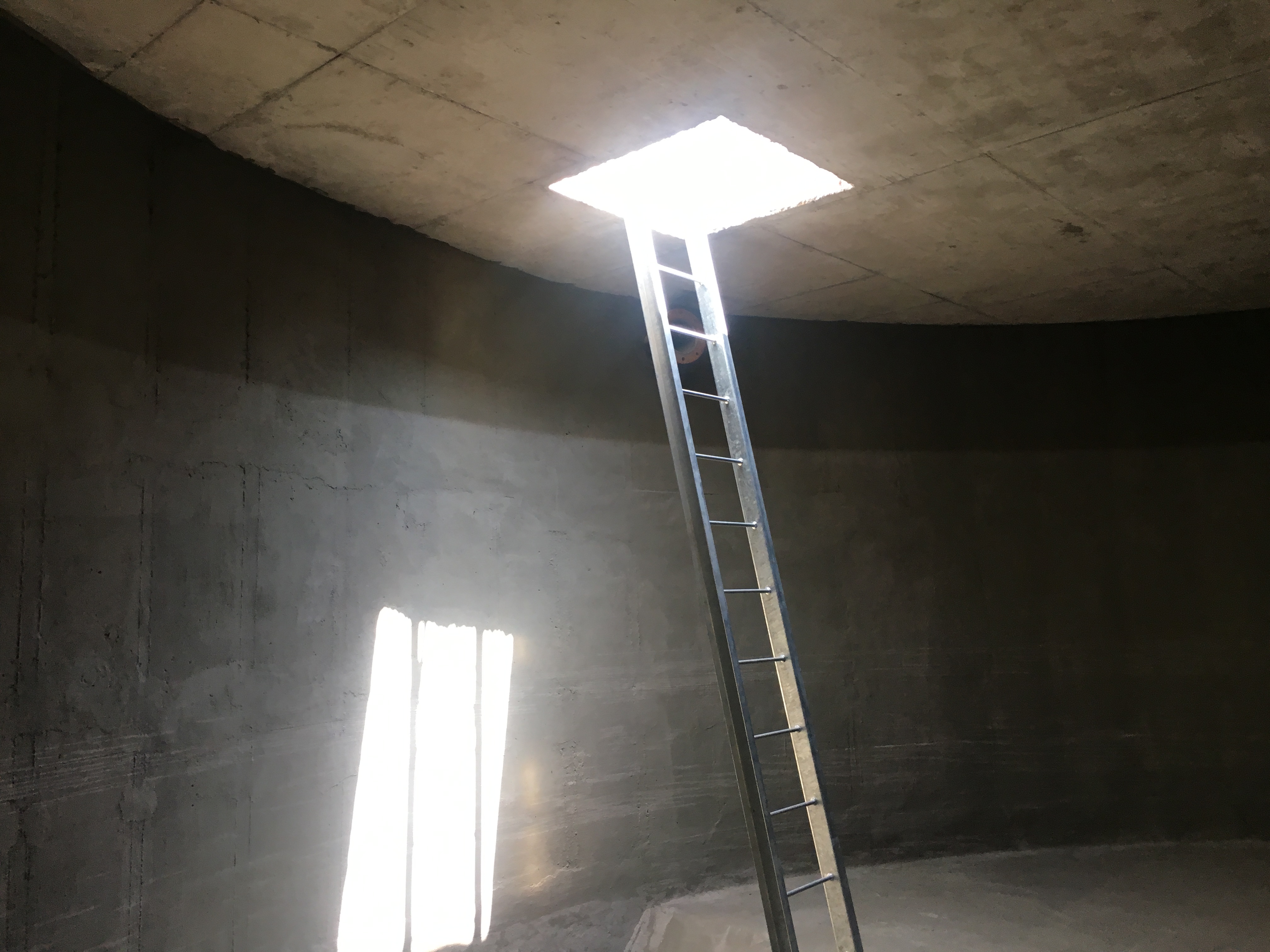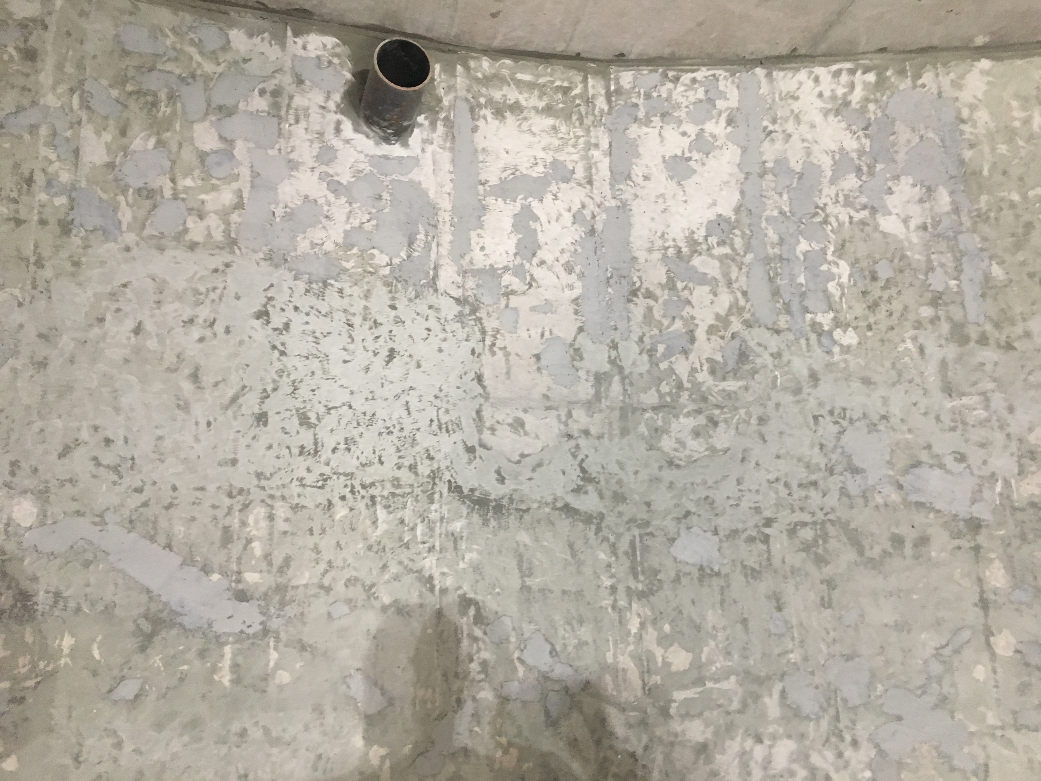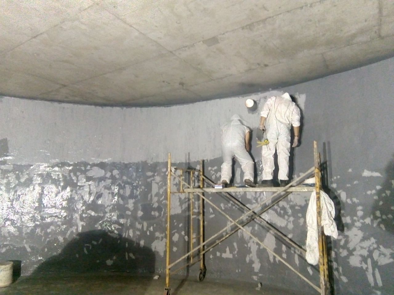 La obra en espacio confinado requirió andamiaje tubular metálico para el trabajo en las paredes curvas a altura. Las fotografías de aplicación registran a dos operarios equipados con trajes de protección aplicando primer epóxico sobre las paredes curvas desde el andamio, con visibilidad clara de la curvatura del muro y de la línea de avance del trabajo. Este registro visual confirma la metodología de trabajo por zonas, avanzando de arriba hacia abajo para evitar contaminación de superficies ya imprimadas.