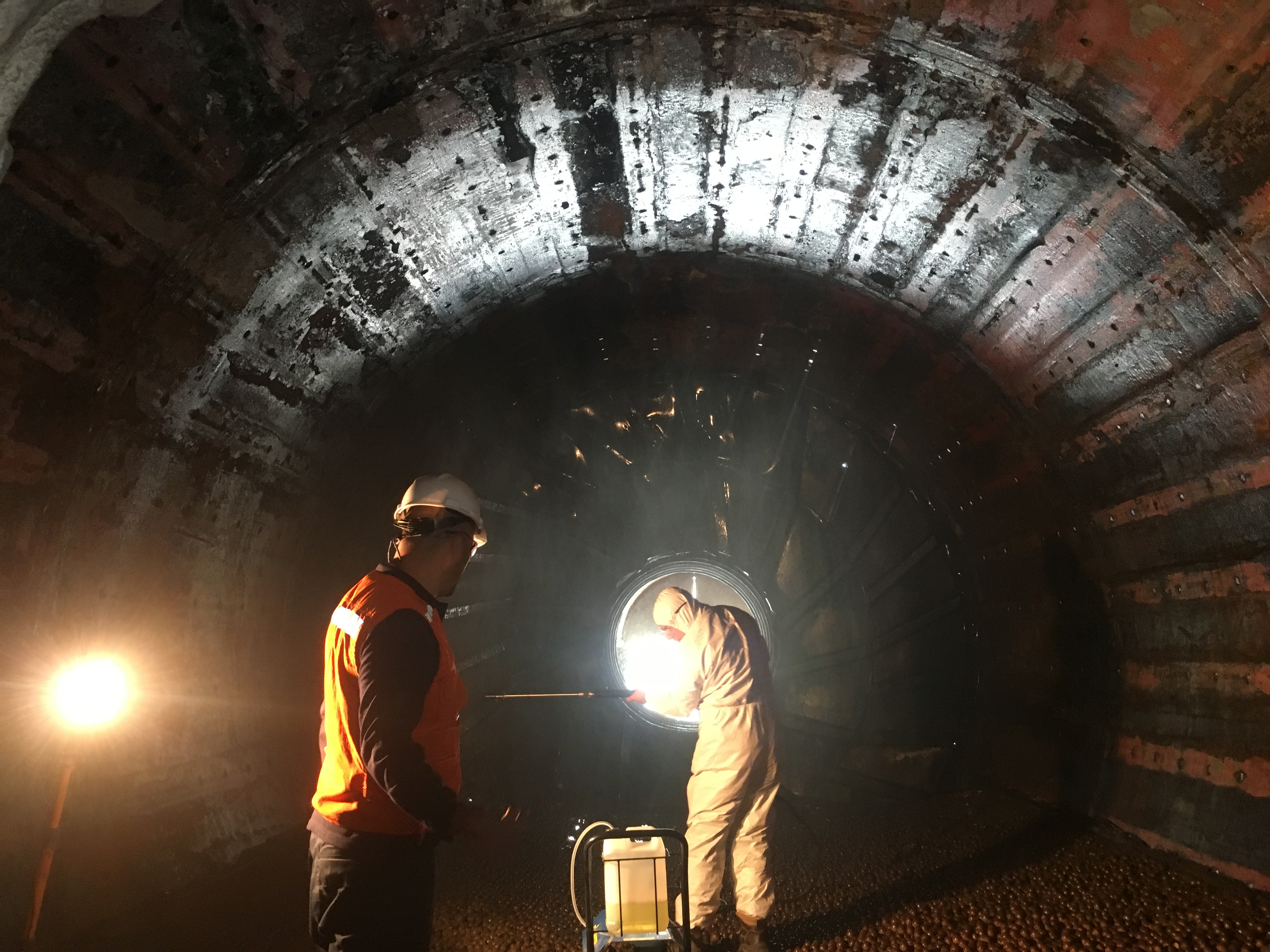 El entorno de servicio de un molino SAG impone condiciones de alta agresividad simultánea: impacto mecánico continuo de las bolas de molienda sobre las paredes, abrasión por la pulpa mineral en movimiento, ataque químico del entorno ácido del circuito de molienda y la humedad permanente asociada al proceso húmedo. Trabajar en el interior del tambor implica además todas las restricciones propias del espacio confinado: ventilación forzada obligatoria, acceso limitado, iluminación artificial y procedimientos estrictos de entrada y rescate. La geometría de la tapa —con nervaduras radiales de radio variable— representó la zona técnicamente más compleja para lograr cobertura continua y espesor uniforme.