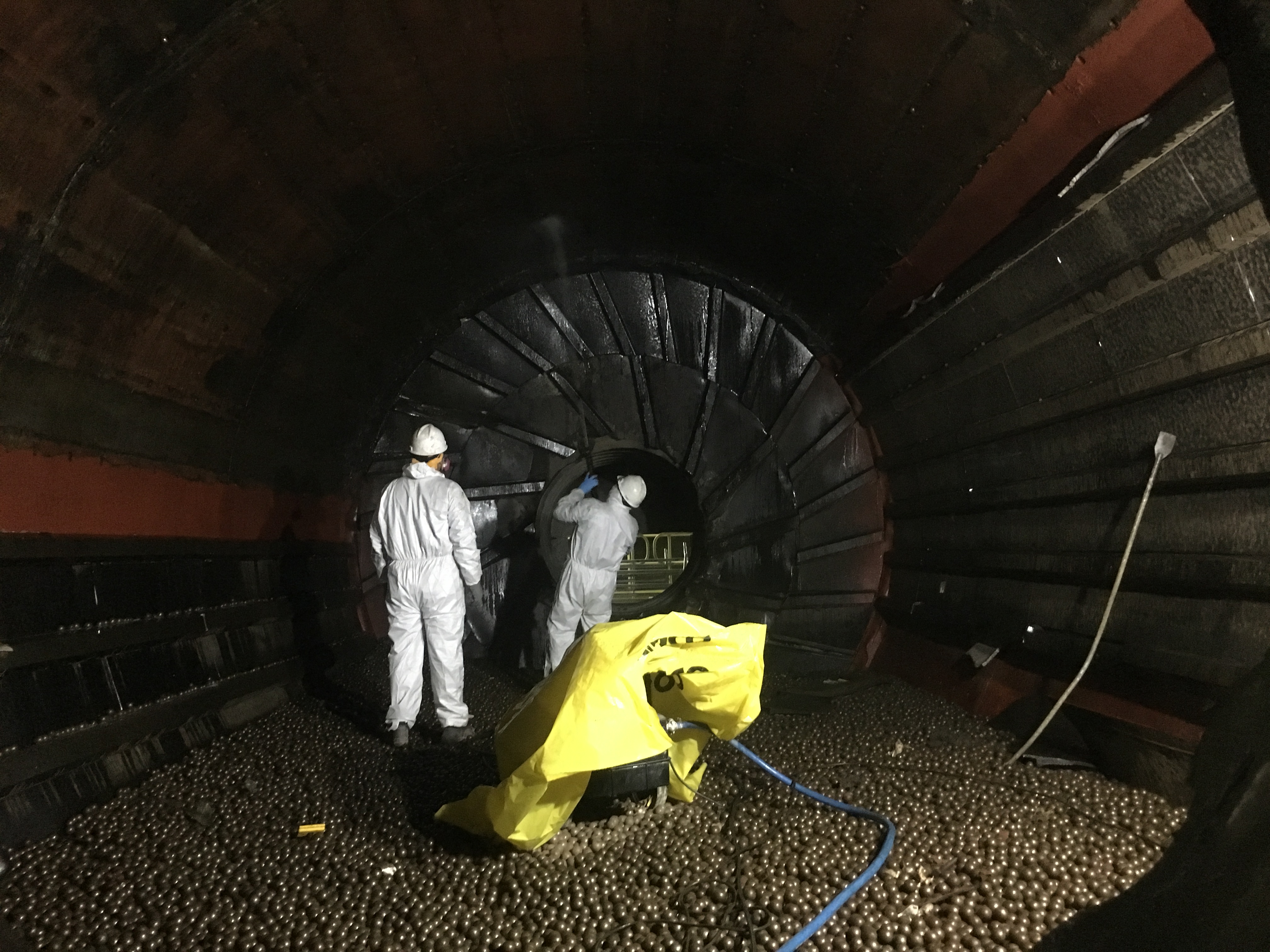 La preparación de superficie fue la etapa determinante para el desempeño a largo plazo del revestimiento. Se ejecutó granallado del interior del tambor hasta grado Sa 2,5 (ISO 8501-1), eliminando completamente la corrosión activa, las manchas de óxido y los contaminantes acumulados documentados en las fotografías de estado previo. Las imágenes de la etapa de preparación muestran el interior del molino con la superficie metálica de color gris oscuro y uniforme tras el granallado, con técnicos en overol blanco y casco ubicados al fondo junto a la tapa. Se observan bolsa de residuos de abrasivo y mangueras de trabajo en el piso, evidenciando el proceso de limpieza y extracción de residuos en espacio confinado. La vista longitudinal panorámica del tambor durante la preparación permite apreciar la longitud completa del cilindro y el contraste entre las zonas con revestimiento rojo parcialmente aplicado en las paredes laterales y la tapa central aún en estado metálico sin tratar.