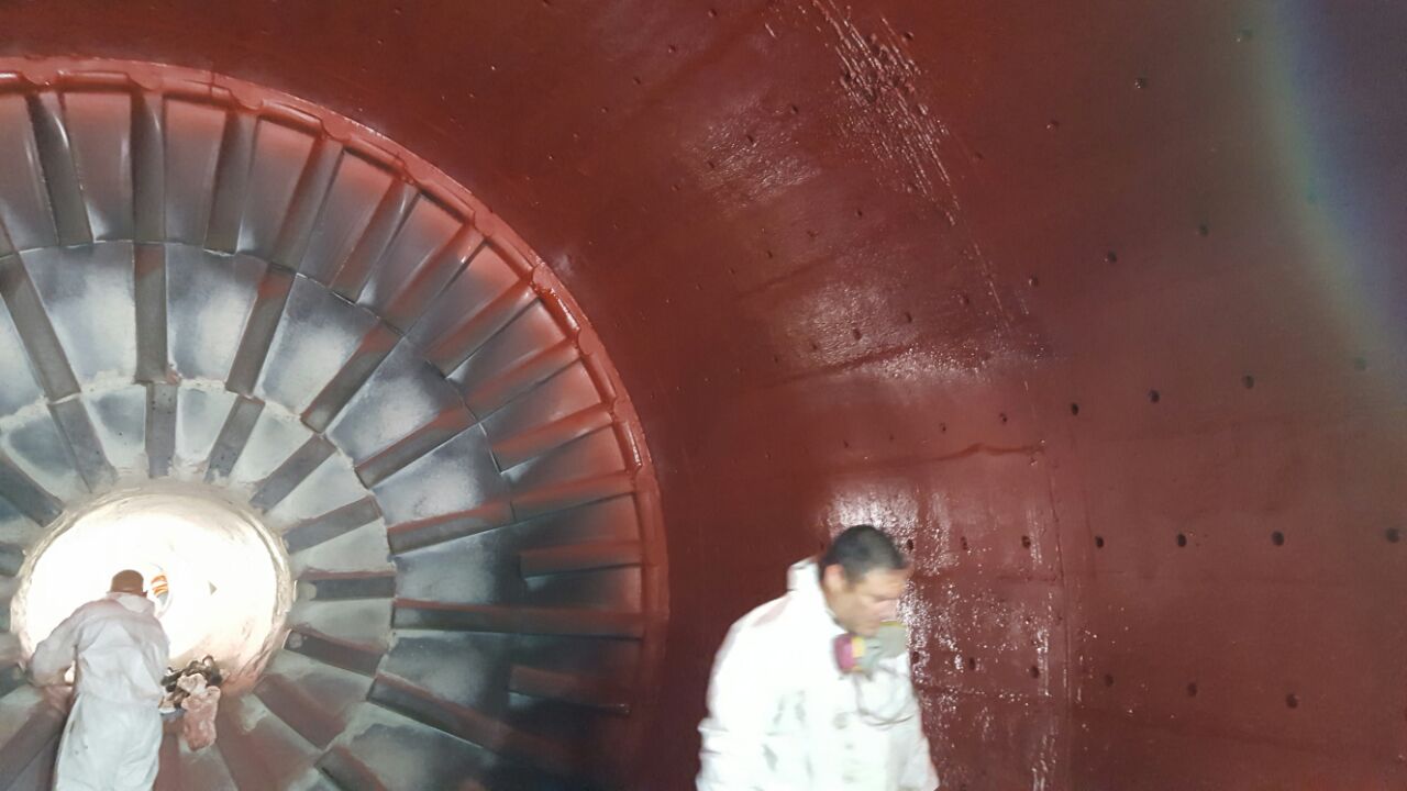 - Para la tapa se instaló un andamio tubular frente a la apertura circular, visible en las fotografías de proceso con dos técnicos con overol blanco y casco trabajando sobre la estructura; las paredes del tambor ya revestidas con poliurea roja contrastan con la superficie oscura de la tapa aún sin tratar