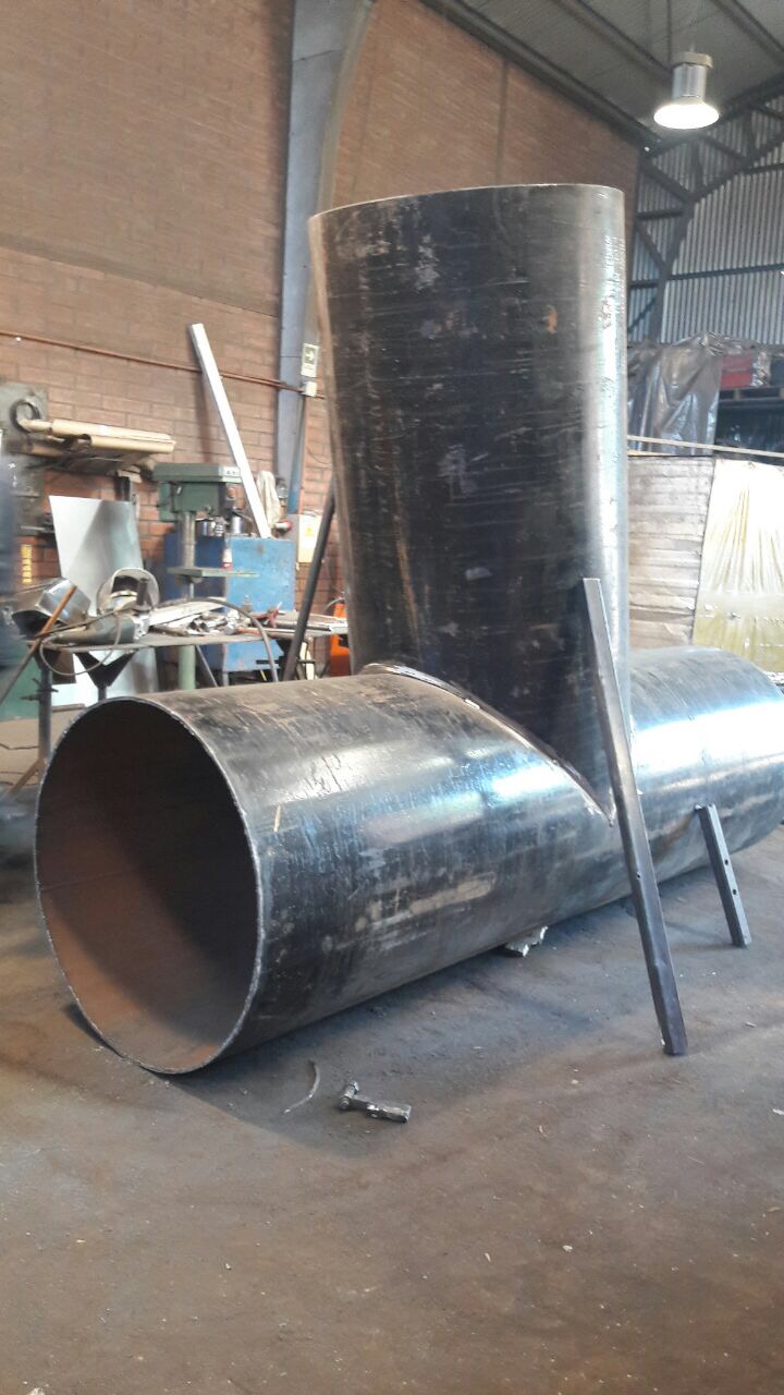 La fabricación se desarrolló íntegramente en el taller de Kronos Mining. Las fotografías de proceso muestran dos spools de gran diámetro en etapa de prefabricación avanzada: un cuerpo T vertical sin bridas y un spool horizontal de mayor longitud apoyado sobre el piso, con maquinaria de taller visible al fondo, evidenciando la escala de la producción y la organización del espacio de trabajo.