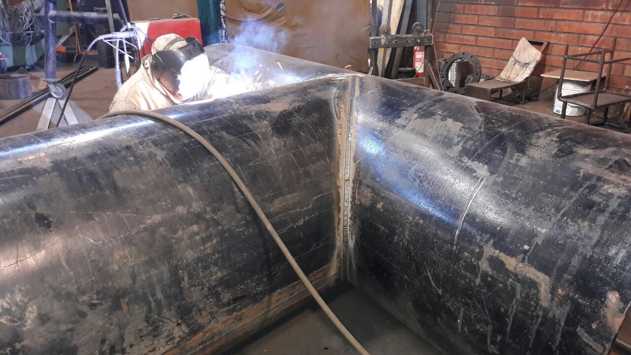 La soldadura de las uniones —especialmente en los cuerpos T— se ejecutó mediante soldadura de arco manual. Las fotografías de proceso capturan al soldador con máscara de protección ejecutando la junta entre el cuerpo principal y el ramal de la pieza T, con chispas y humo visibles que confirman la soldadura en arco activo. La secuencia de soldadura y el precalentamiento del material se controlaron para minimizar la tensión residual y la distorsión angular. Tras cada soldadura se realizó inspección visual de la junta y, donde correspondía, verificación dimensional del conjunto. Las caras de brida fueron verificadas en paralelismo con comparador de carátula antes de dar conformidad a cada spool para despacho.