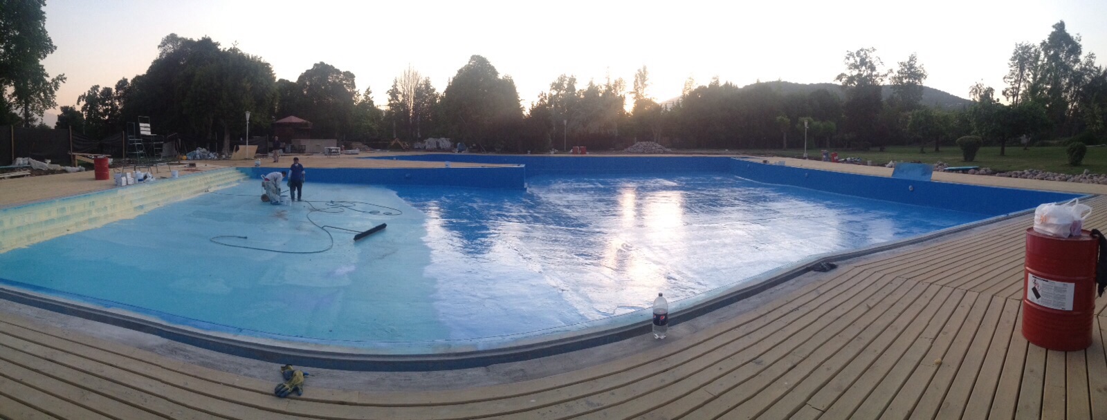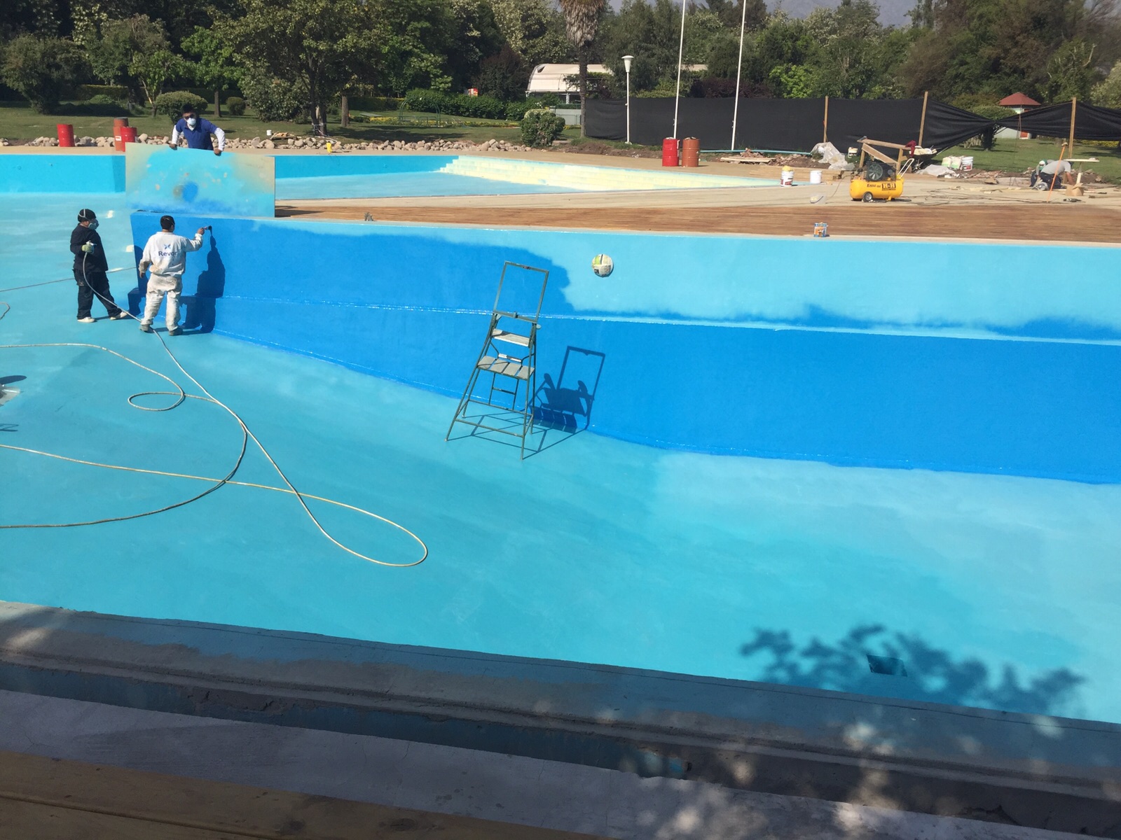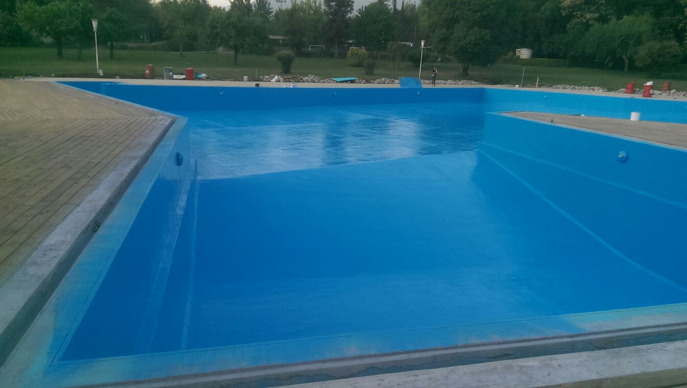 A esto se sumaban las condiciones propias del entorno: ciclos repetidos de llenado y vaciado, exposición a productos químicos de tratamiento de agua (cloro, algicidas, pH reguladores) y cargas mecánicas derivadas del uso intensivo. La solución debía garantizar adhesión duradera sobre concreto, flexibilidad suficiente para acompañar los movimientos estructurales menores, y resistencia química frente a los agentes de sanitización. Se descartaron pinturas epóxicas convencionales por su fragilidad ante fisuras y su vida útil limitada, optando en cambio por un sistema elastomérico de mayor prestación.