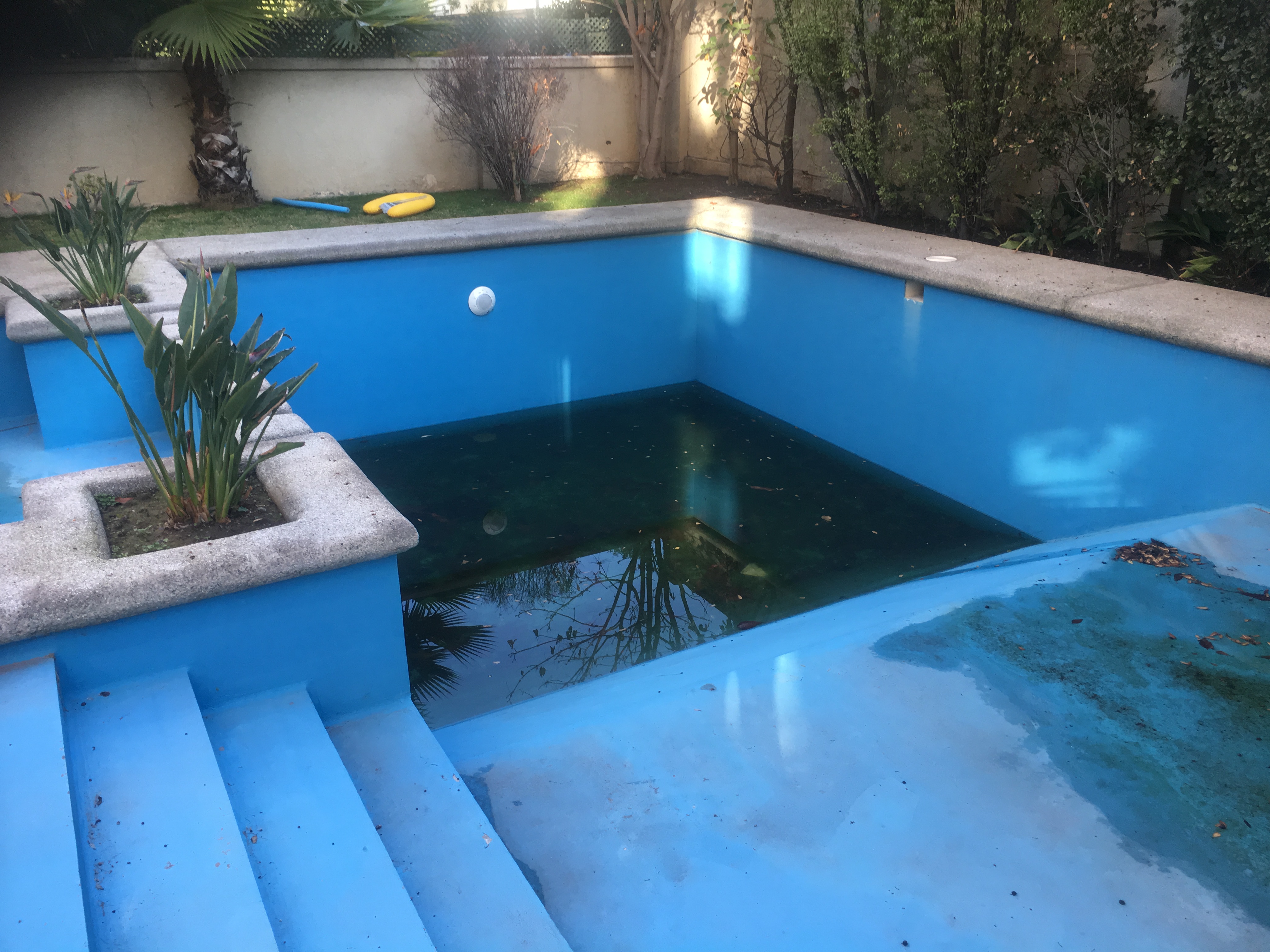 El estado previo de la piscina evidenciaba un deterioro avanzado del revestimiento original. Las fotografías de inspección muestran la cuenca principal con agua estancada de coloración oscura, cargada de sedimentos, indicativa de filtración de partículas del sustrato y descomposición orgánica. El revestimiento azul antiguo presentaba desgaste visible con pérdida de adherencia, zonas expuestas y degradación superficial generalizada en paredes y fondo.