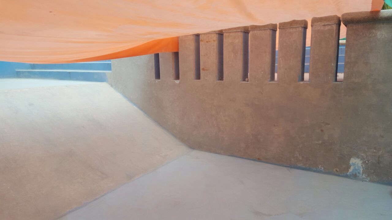La preparación de superficie comenzó con el vaciado y limpieza del vaso, seguido de la eliminación mecánica del revestimiento deteriorado. Las fotografías de preparación muestran la superficie de hormigón limpia con imprimación gris claro aplicada y los bordes superiores correctamente enmascarados con tela de protección naranja y cinta, lo que garantizó transiciones limpias entre la membrana nueva y los elementos de terminación existentes.