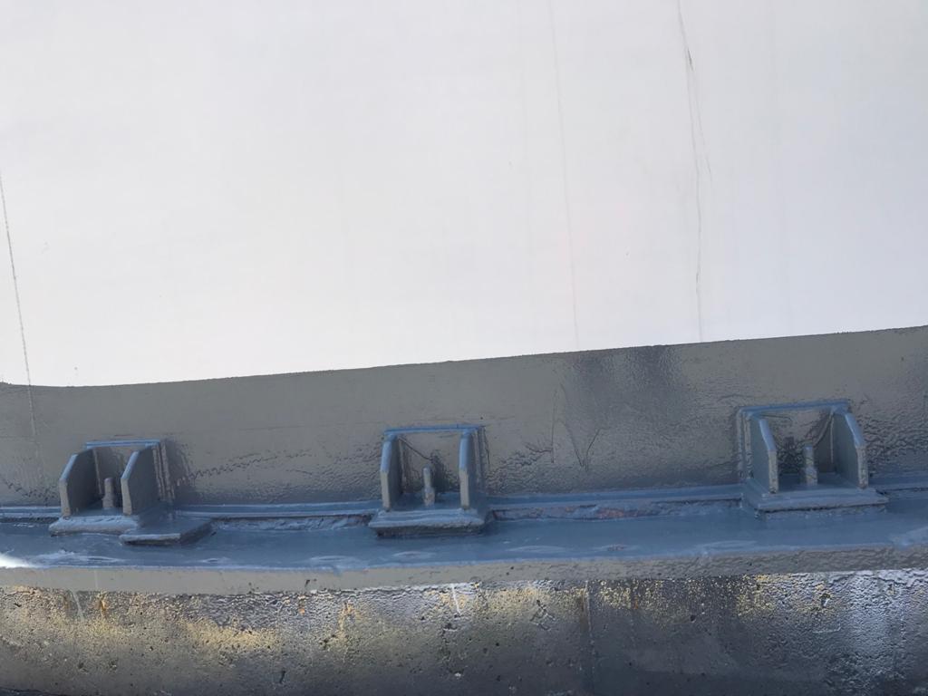 Destaca especialmente la cobertura de los elementos de geometría compleja: numerosos anclajes de acero distribuidos en el perímetro quedaron completamente encapsulados por el revestimiento, sin que se observen fisuras, delaminaciones ni zonas de sombra en la interfaz entre el metal y la poliurea. Las ménsulas estructurales de la junta entre el cuerpo del silo y el skirt fueron envueltas de forma integral, eliminando los puntos de acumulación de humedad que son origen habitual de corrosión prematura en este tipo de elemento.
